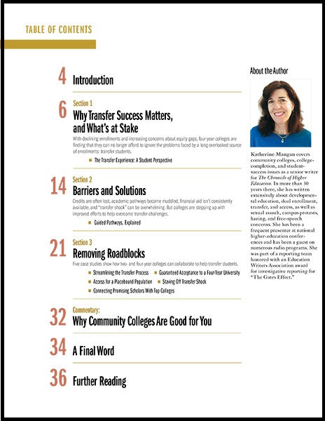 This Chronicle issue brief analyzes which approaches are working and provides practical advice on how to eliminate the barriers standing in students’ way. Its focus is on the most common form of transfer — from two-year to four-year colleges— and includes the latest data to inform leaders how best to ensure the success of this increasingly important and often underappreciated student population.